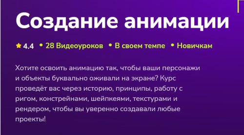 Хотите освоить анимацию так, чтобы ваши персонажи и объекты буквально оживали на экране? Курс проведёт вас через историю, принципы, работу с ригом, констрейнами, шейпкеями, текстурами и рендером, чтобы вы уверенно создавали любые проекты!